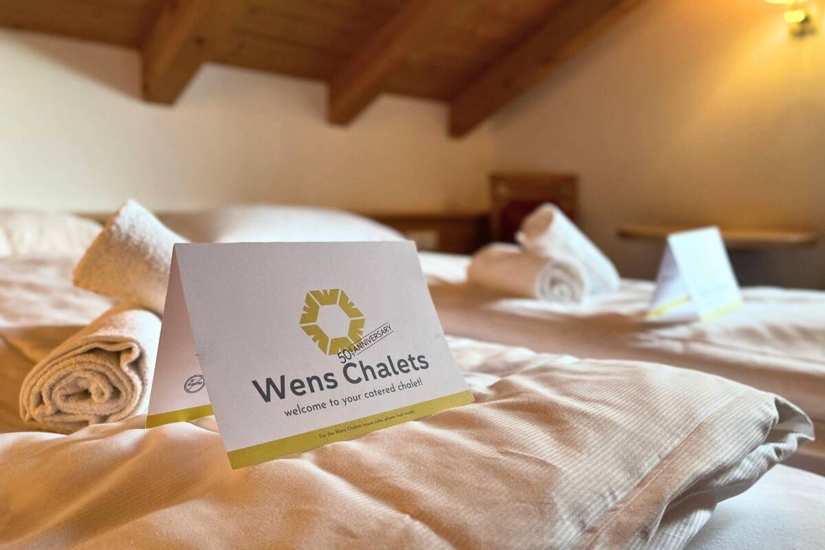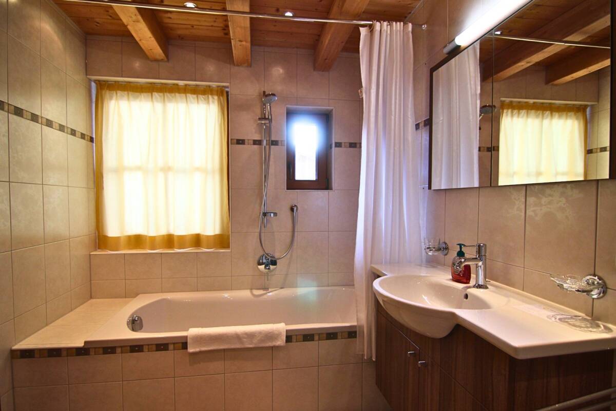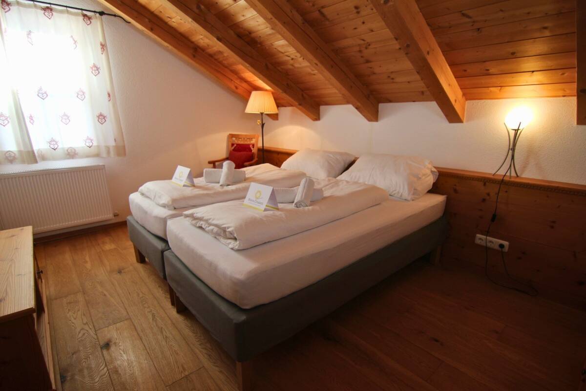 On the ground floor, the spacious living room offers stunning views. It features a cosy seating area with an open fireplace and a large flatscreen TV, perfect for reflecting on the day's adventures with friends or family. Meanwhile, your chalet hosts will be preparing a delicious three-course dinner in the kitchen. This separate space, adjacent to the living room, also includes the dining area, where your meal will be served. Thanks to the open kitchen layout, it’s easy to interact with your chalet hosts. After dinner, you can linger at the table or sink into the comfortable sofas. Also on this floor is the master bedroom—a double room with an ensuite bathroom featuring a bathtub. If desired, this room can be converted into a four-person bedroom.