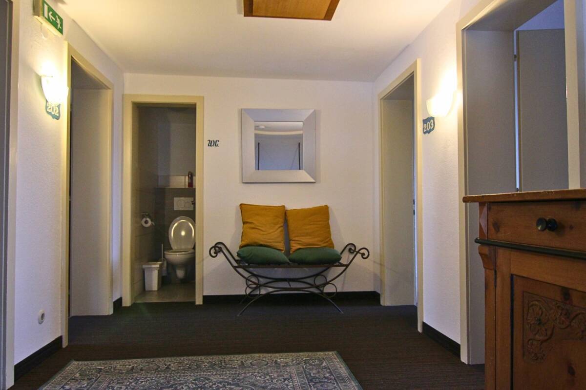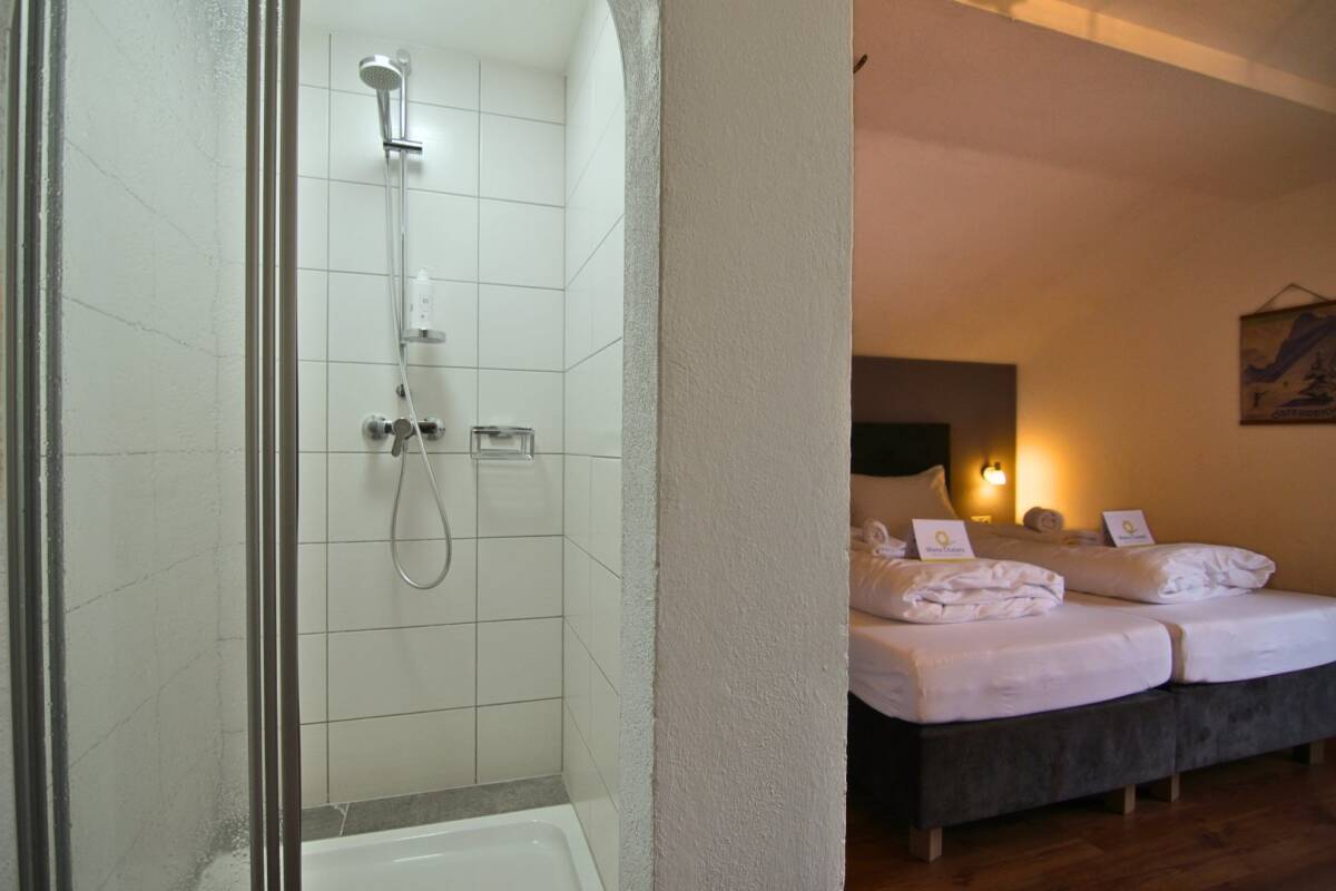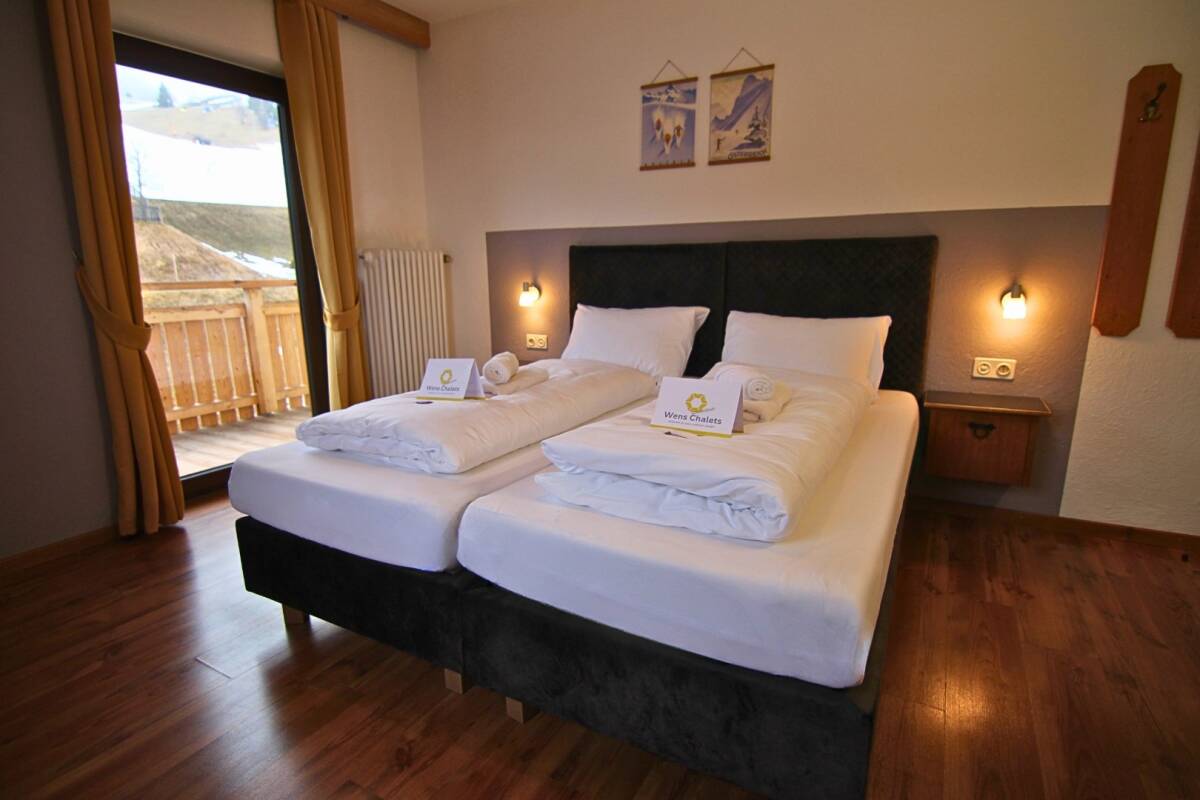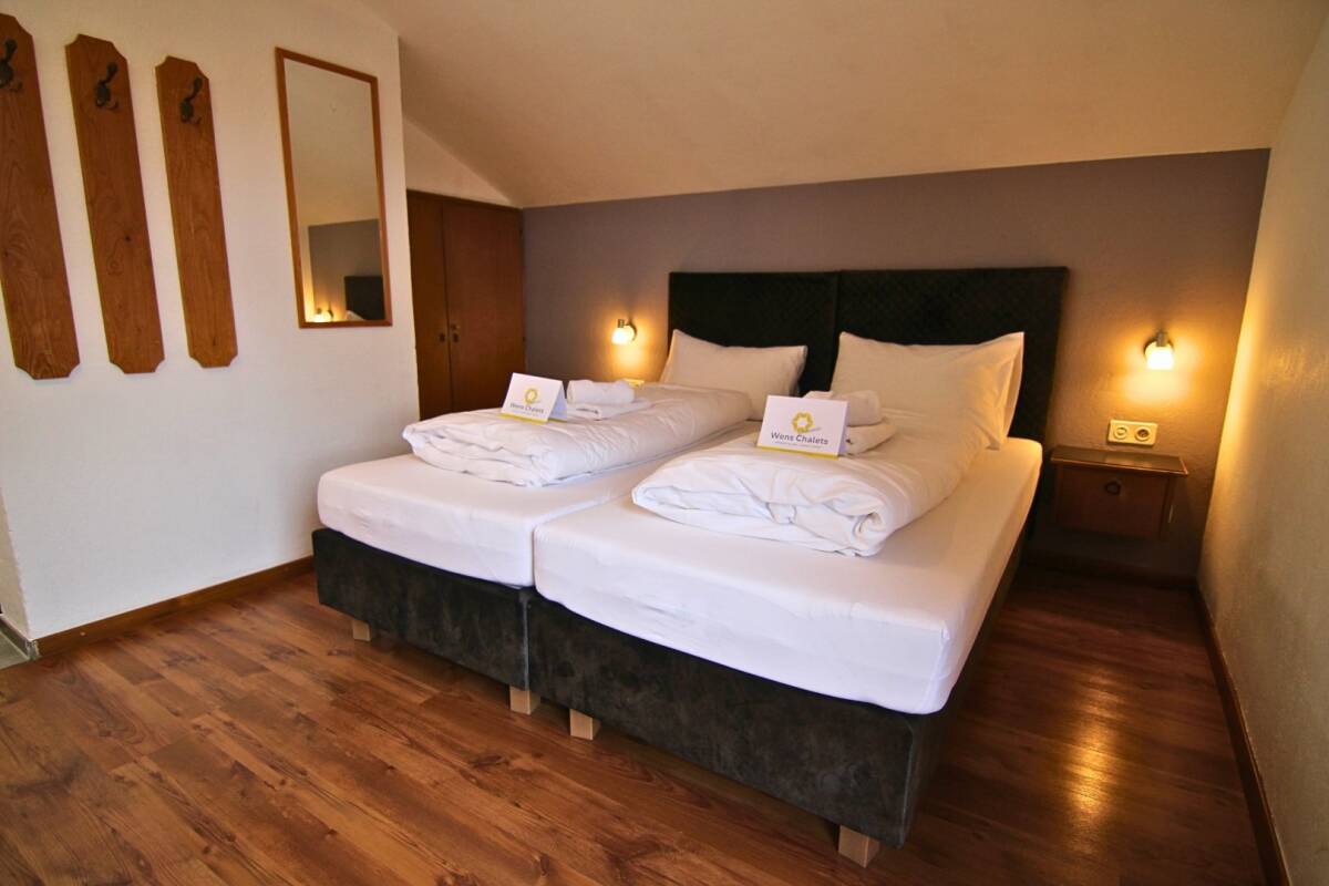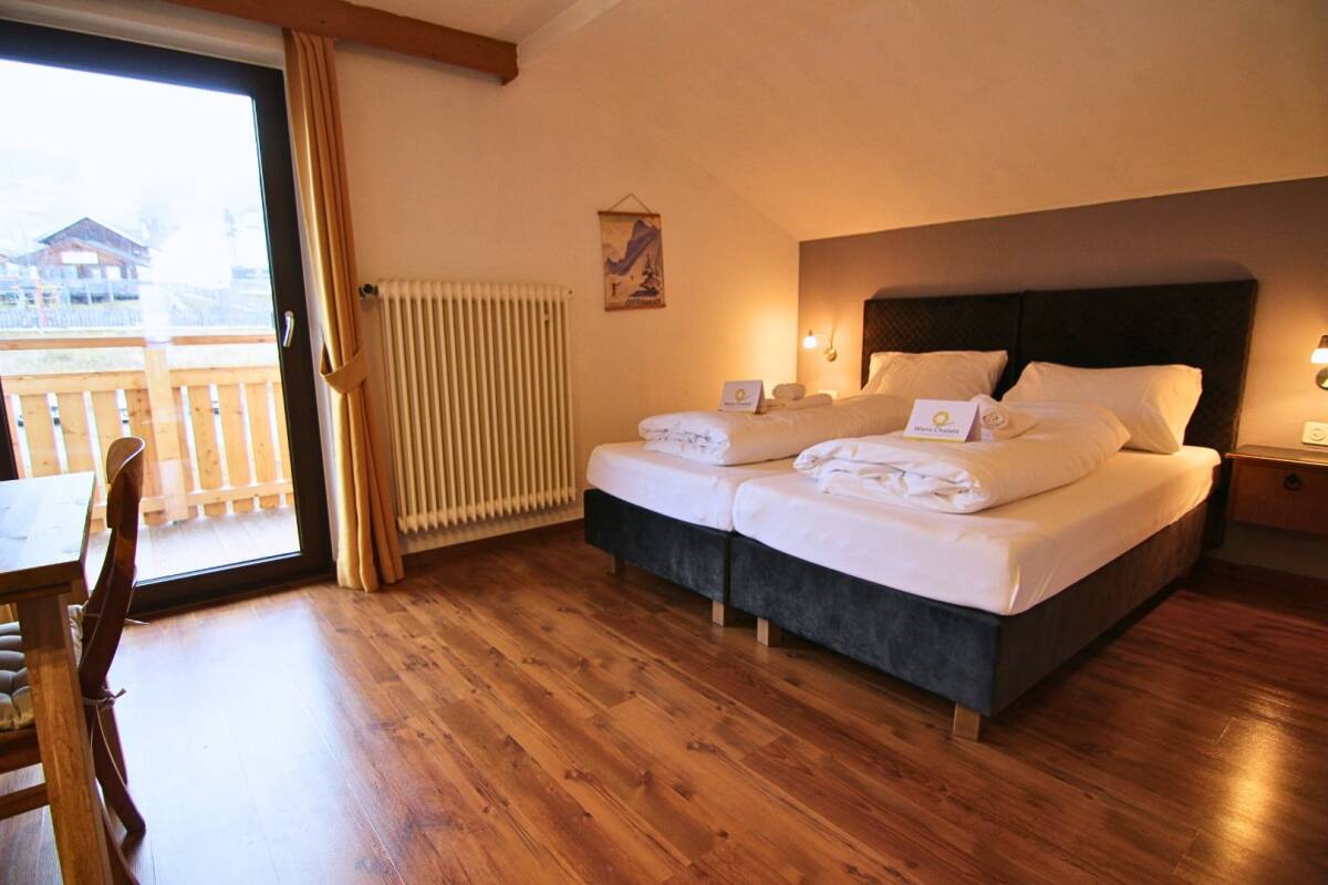 The chalet features ten bedrooms (nine twin rooms and one triple room), spread over the top two floors. Four of the bedrooms on the top floor come with ensuite bathrooms. The six bedrooms on the first floor share two bathrooms.